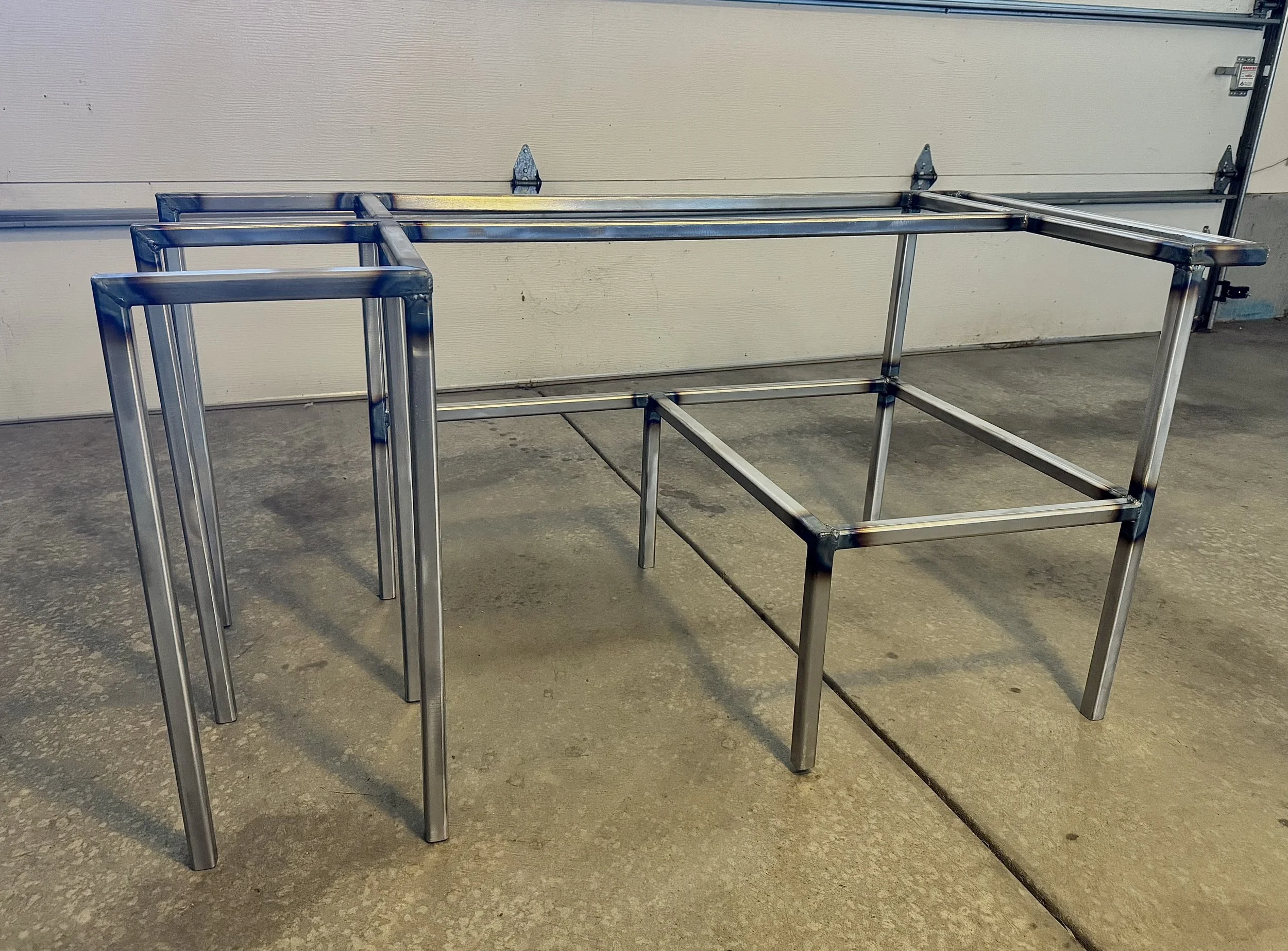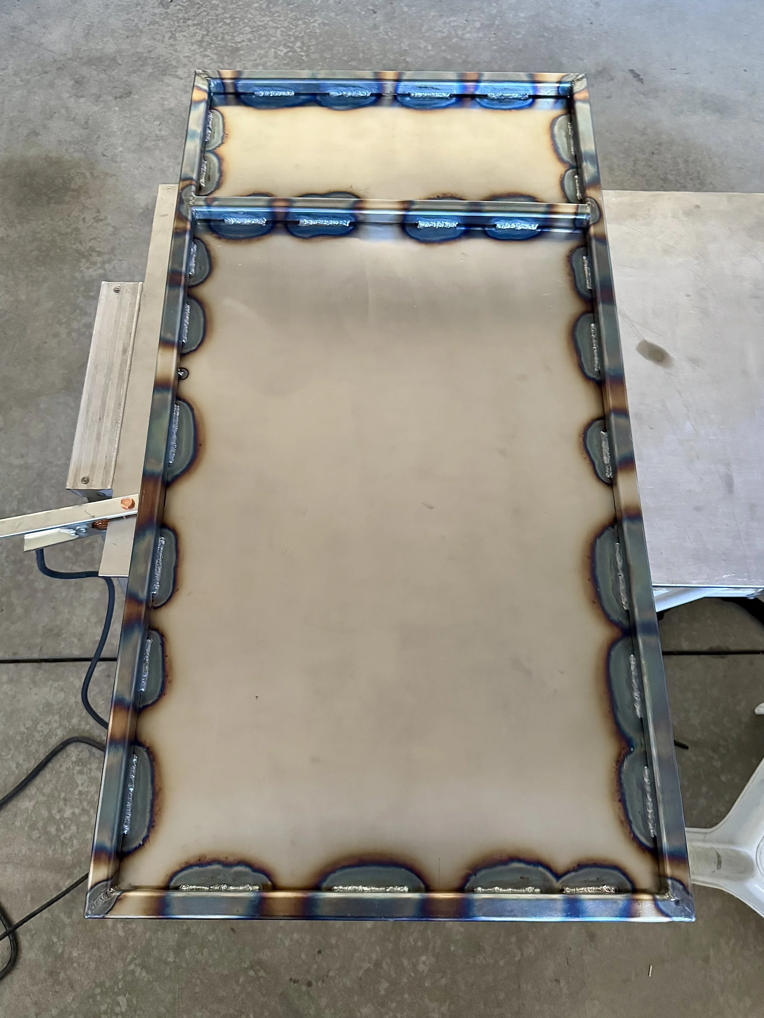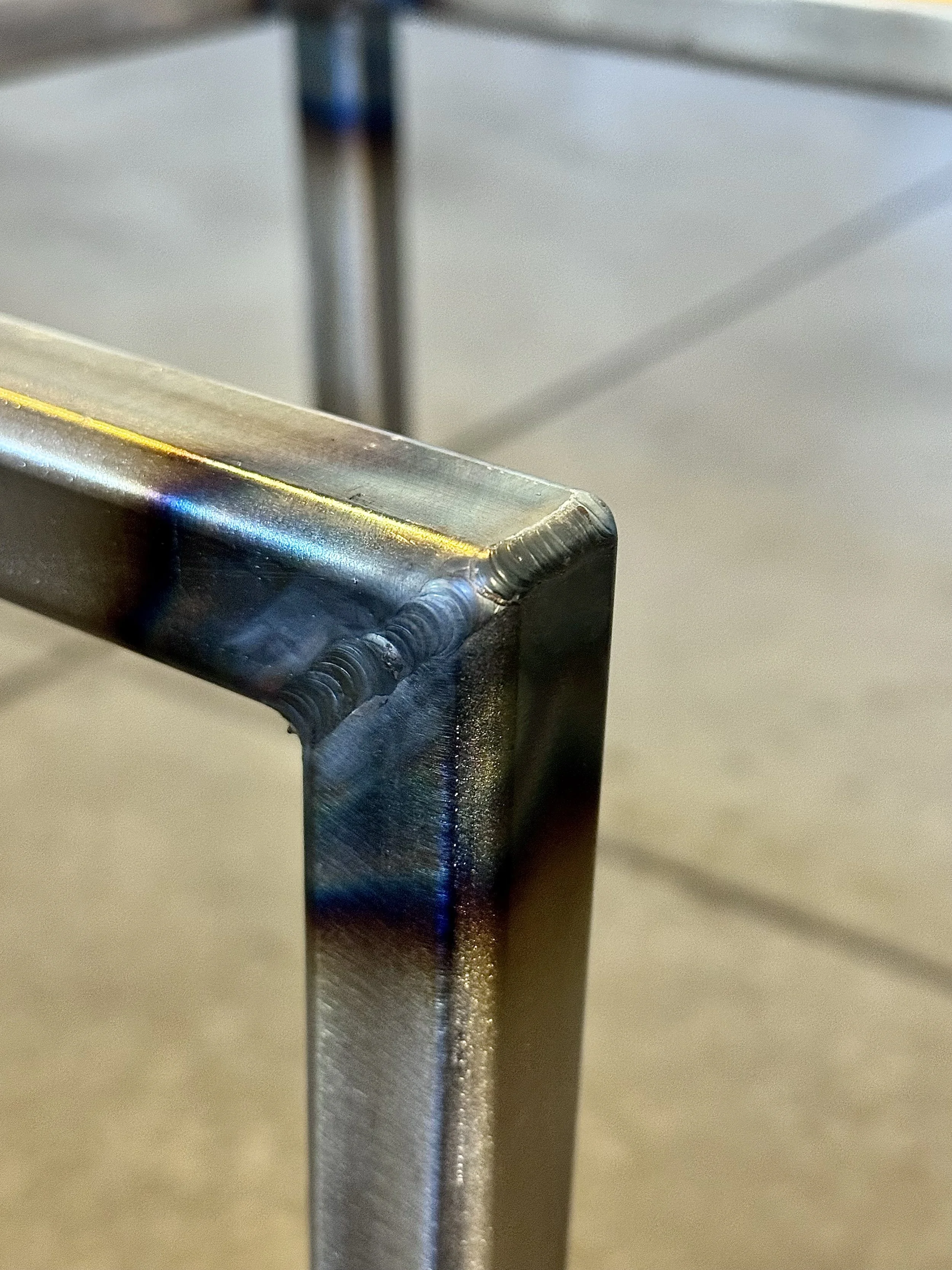 3/8” mild steel plate tabletop welded to frame with 1/8” filler rod and 1/8” E3 electrode at 105-115 amps. Final assembly included instillation of caster wheels and eye bolt anchors for gas canister chains. Finishing was accomplished through surface conditioning tool as well as Scotch Brite discs and angle grinder.