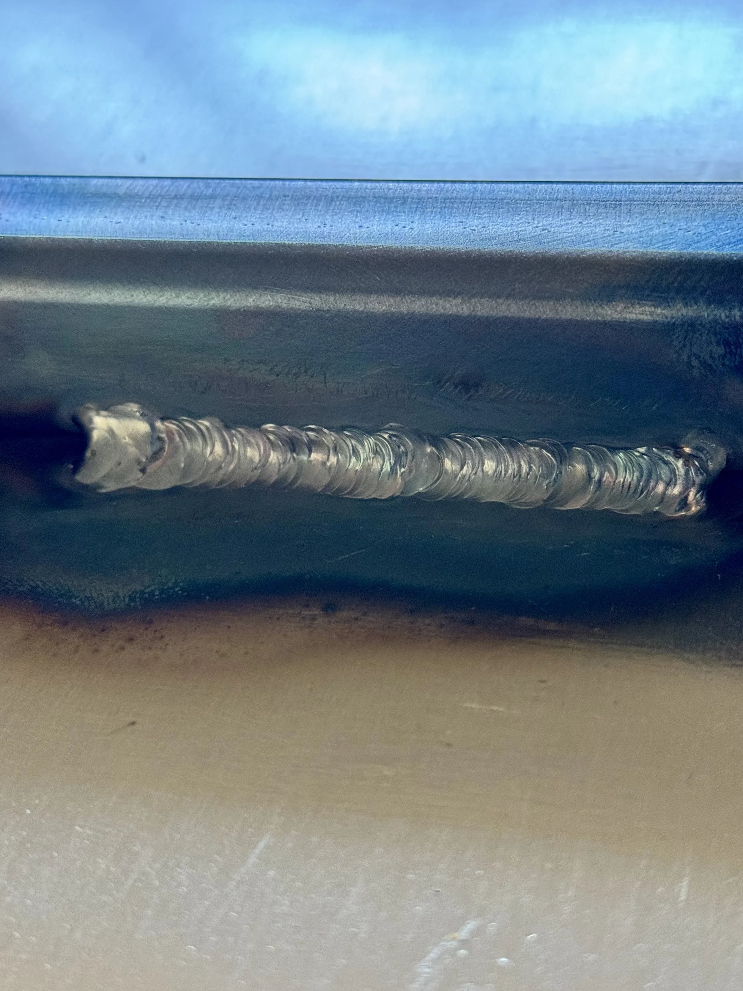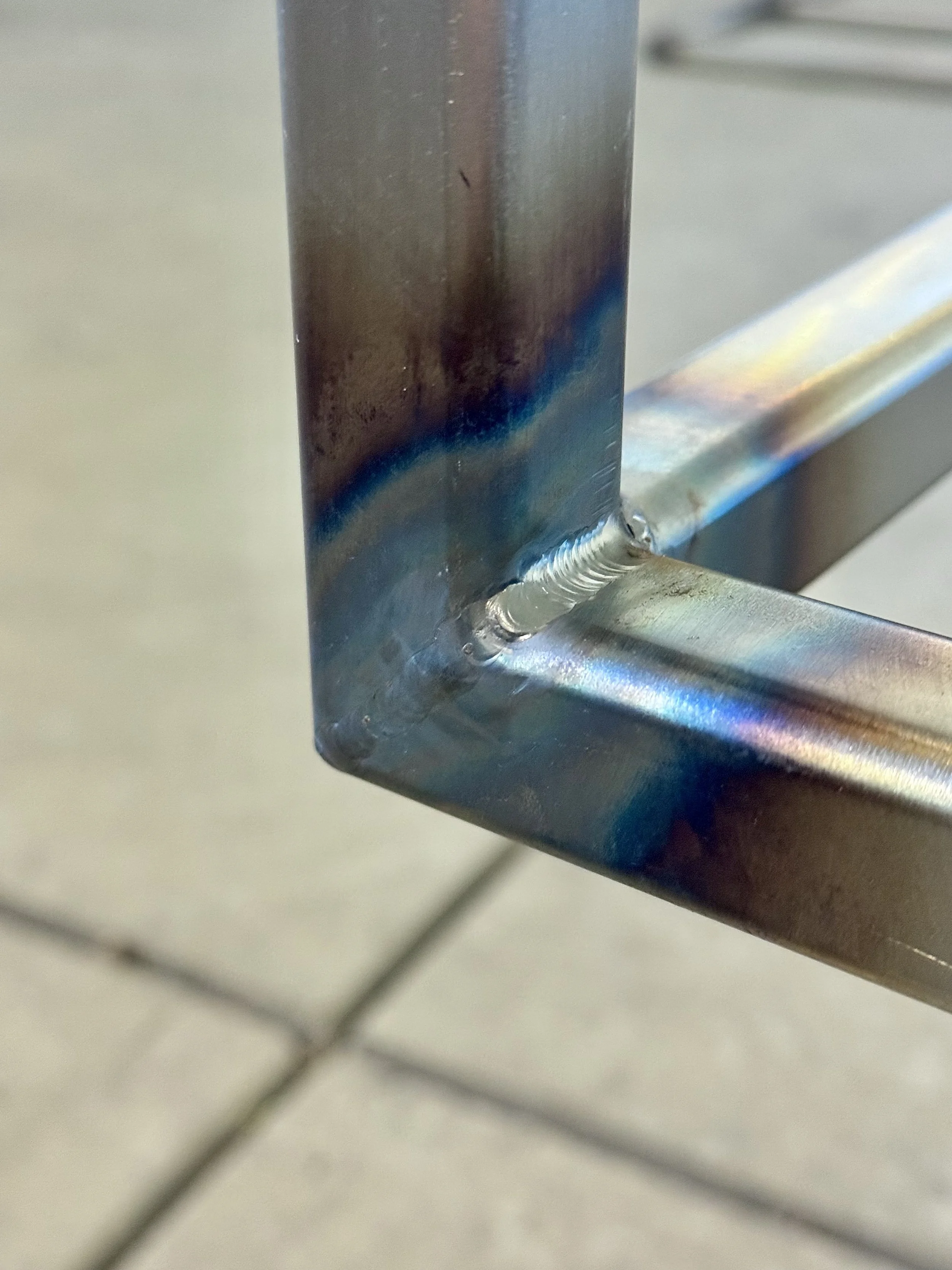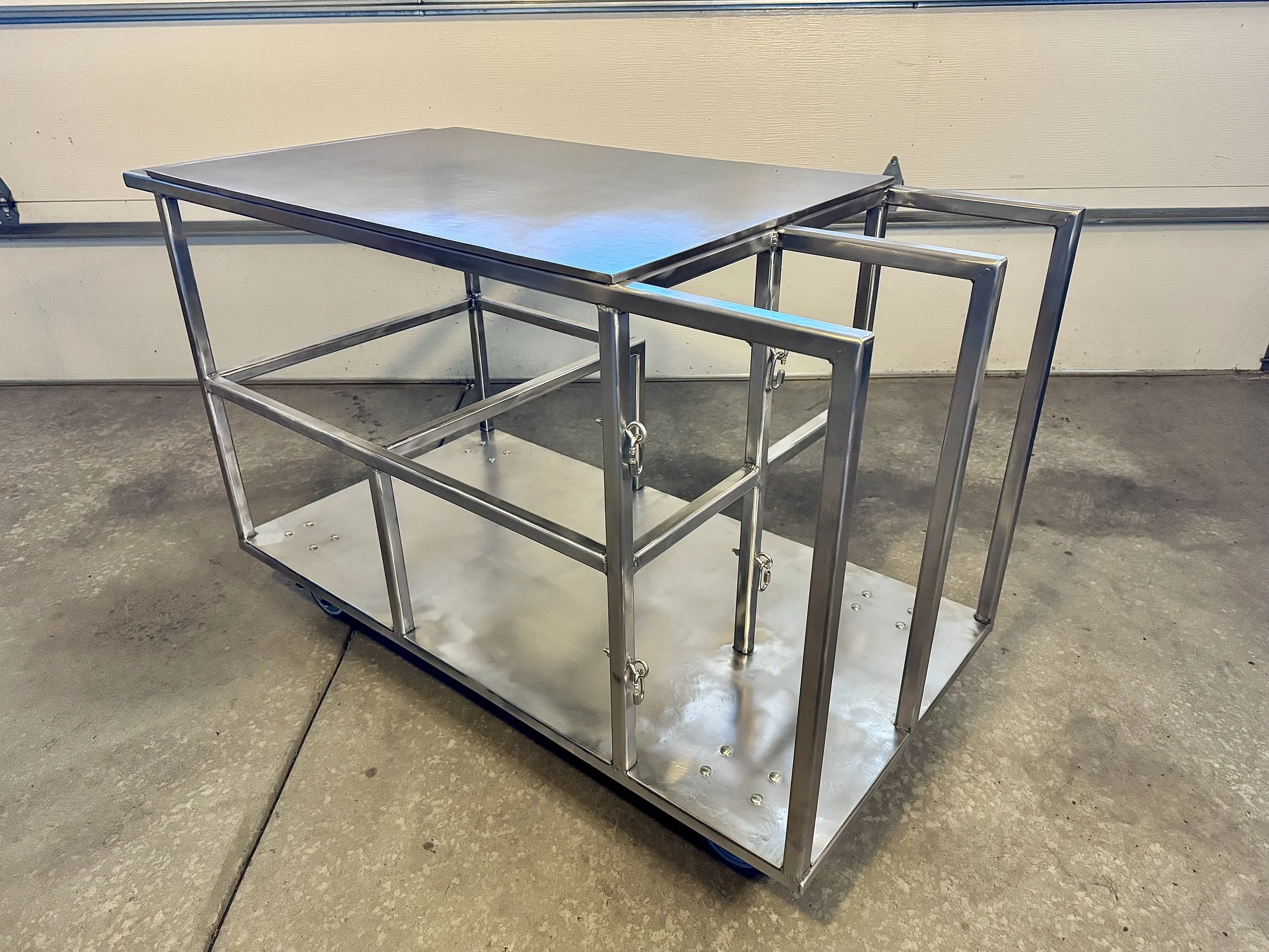 3/8” mild steel plate tabletop welded to frame with 1/8” filler rod and 1/8” E3 electrode at 105-115 amps. Final assembly included instillation of caster wheels and eye bolt anchors for gas canister chains. Finishing was accomplished through surface conditioning tool as well as Scotch Brite discs and angle grinder.