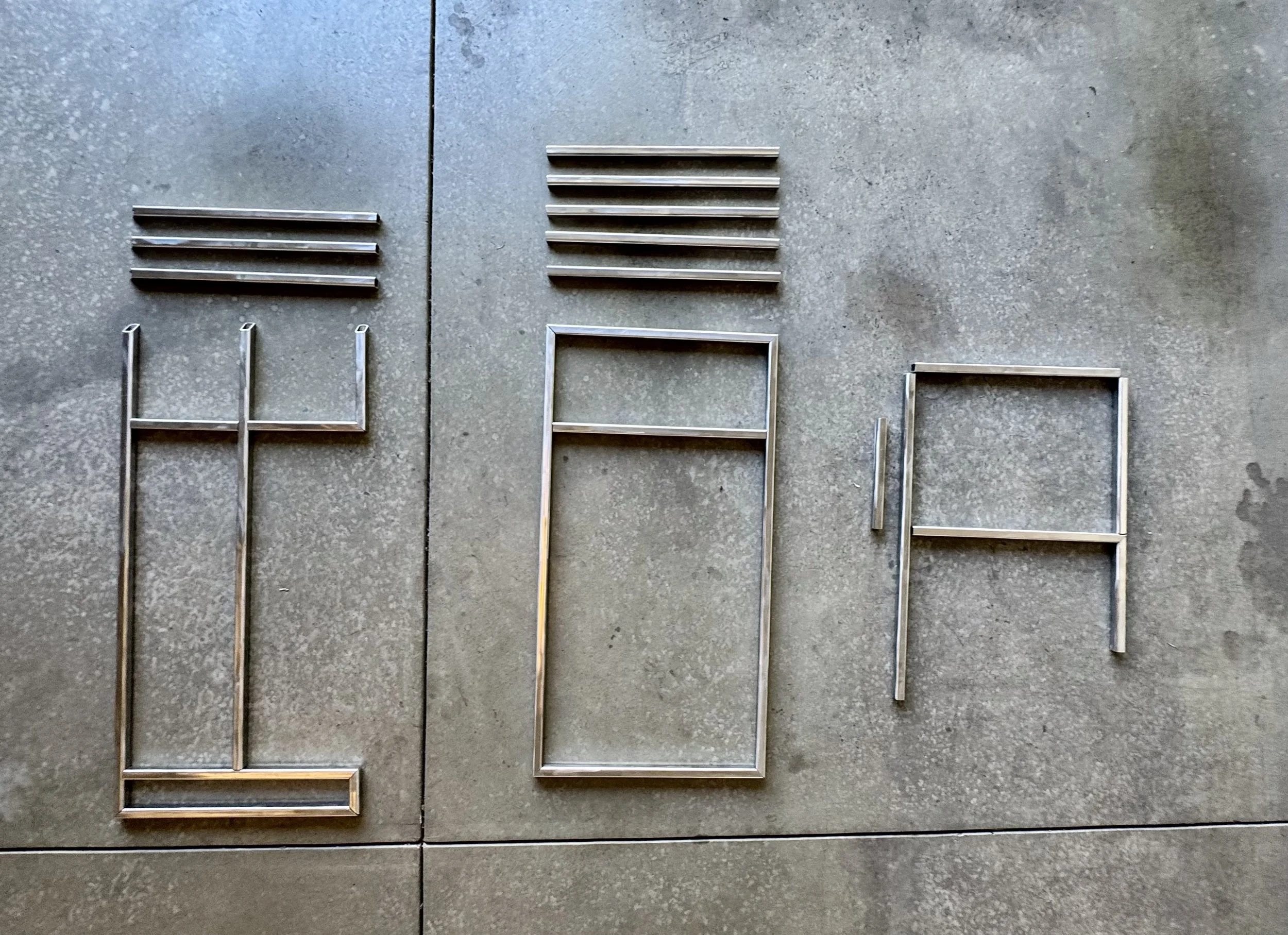 All parts fabricated from hot rolled mild steel. Descaled using angle grinder and flap discs. Frame cut from 1”x1”x1/8” square tube with angle grinder and metal cutoff wheel. Fitment and welding prep achieved through bench grinder.